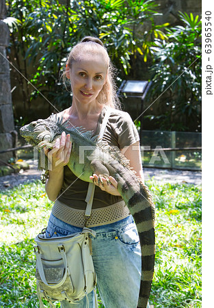 The young woman holds iguana on hands