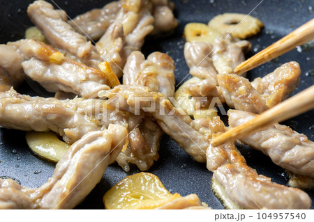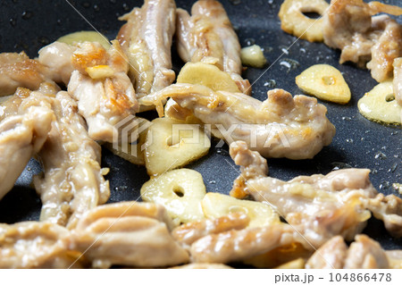 鶏肉(若鶏セセリ)とニンニクをフライパンで炒める調理シーン。