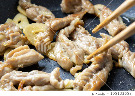 鶏肉(若鶏セセリ)をフライパンで炒める調理シーン。