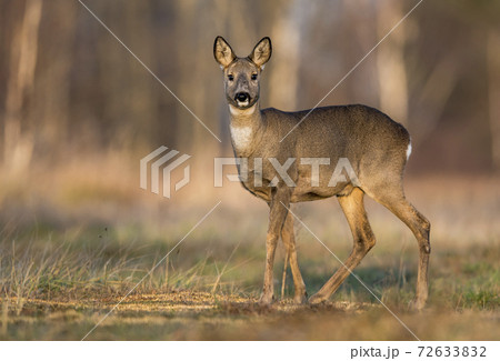 Young wild deer, standing in the forest, morning light. deer in the forest. rays of the sun. sunset