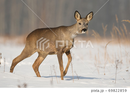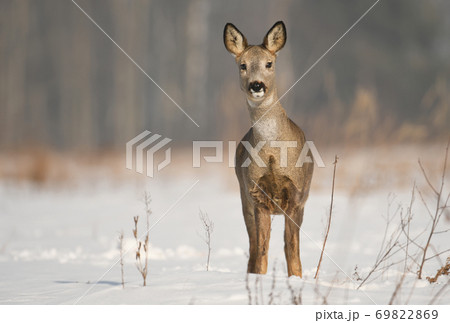 Female Roe deer portrait in the winter forest. Animal in natural habitat