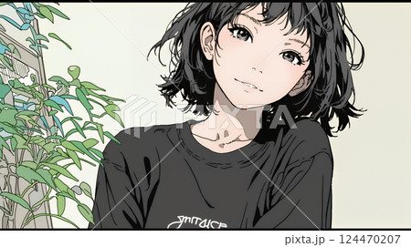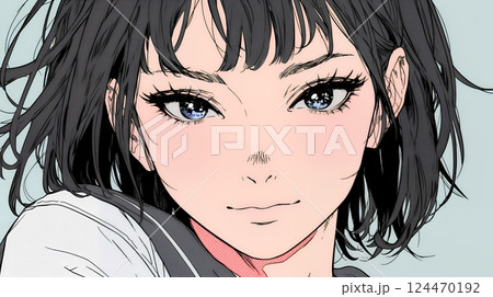 ちょっとだけ笑っているおかっぱの女性のイラスト