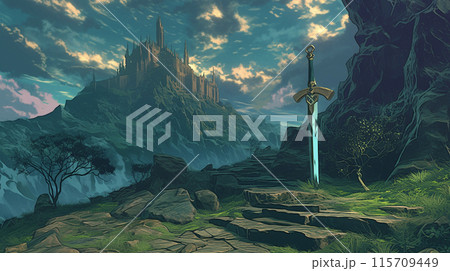 聖剣エクスカリバーとキャメロット城の背景 AI画像