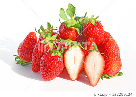 collection of strawberries on white backdrop, displaying variations from whole to sliced. Vivid red hue and detailed texture make each piece stand out distinctly