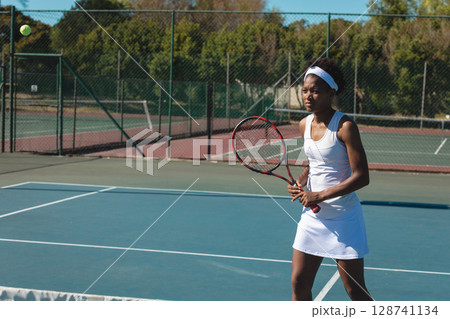 Female tennis player preparing to hit ball on hard court, with racket and ball, copy space