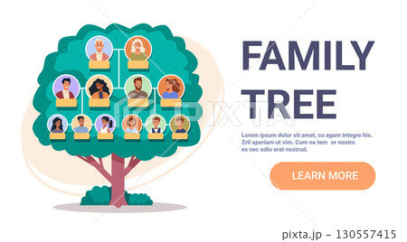 Family tree genealogy chart people portraits connected green tree diverse relatives flat style website banner