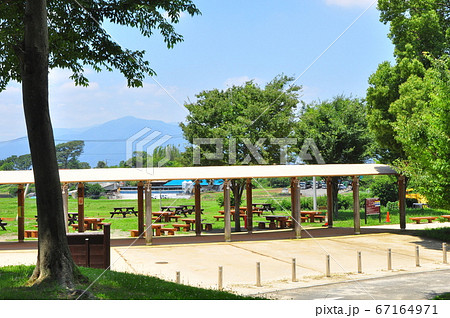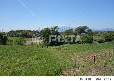 神奈川県茅ケ崎市 県立茅ヶ崎里山公園 バーベキュー場と新緑と丹沢山系山並み