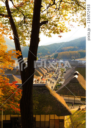 秋の大内宿 町並みと紅葉(日本福島県南会津郡下郷町)