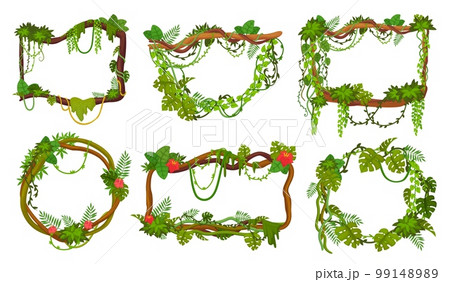 Liana frames. Rainforest thicket frame for game ui, cartoon jungle creeper on branches, creeping rope vines ivy plant tropical vegetation foliage, set ingenious vector illustration