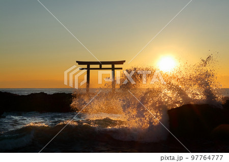「茨城県」海岸に佇む鳥居と日の出 大洗磯前神社