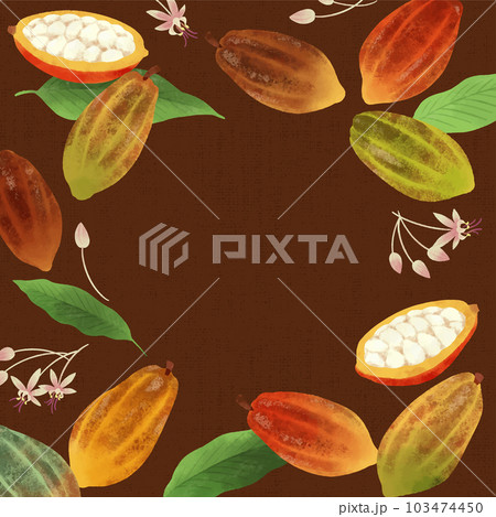 いろいろなカカオ豆・花と葉っぱの水彩イラスト/茶