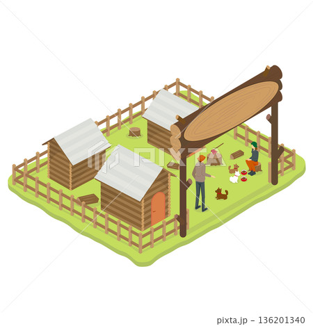 ログハウスと薪割り体験ができるキャンプ場のアイソメトリックイラスト