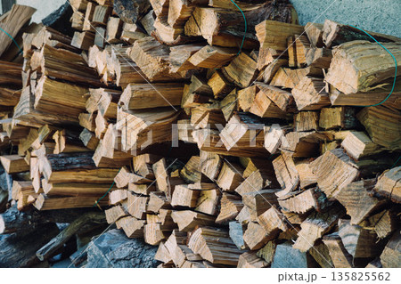 乾燥して薪棚に収められた、楢の薪