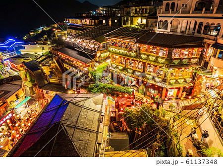 台湾・九份の幻想的な夜景 ライトアップされた阿妹茶樓とレトロな街並み