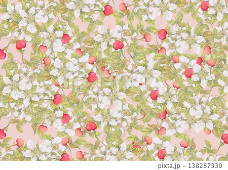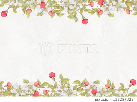 早春〜春の植物、花を咲かせたイチゴとタネツケバナの水彩画イラスト
