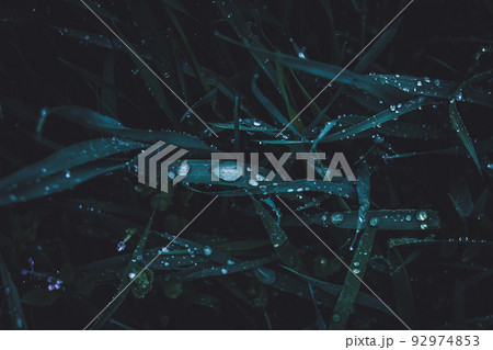 Beautiful large drops of fresh clean transparent water on grass leaves in the morning in a dark style, macro. Grass in the morning dew in spring summer on a green background in nature