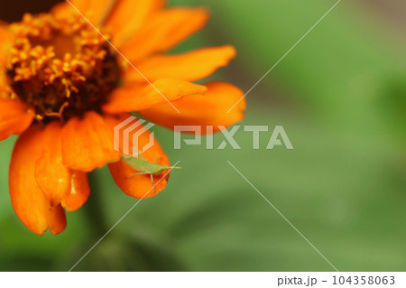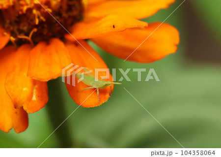 オレンジ色のジニア花に止まる赤ちゃんバッタ