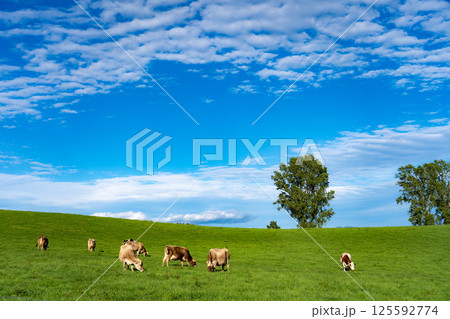 草原に草を食む牛と青空