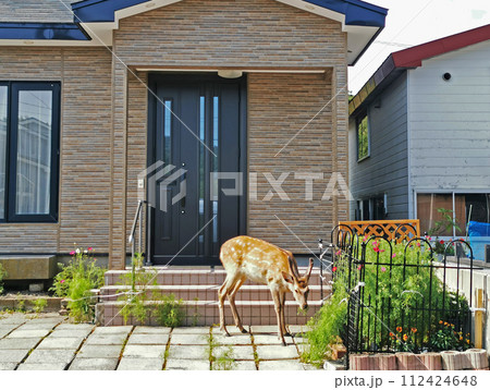 玄関先のコスモスを食べるエゾシカ ガーデニングや家庭菜園を荒らす野生の鹿 北海道 住宅地