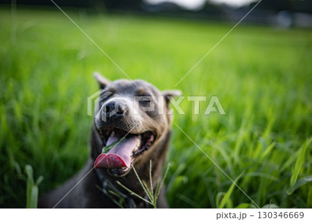 草原で草を食べる犬 犬 草原 ペット 食べる 動物 干支 十二支 ピットブル