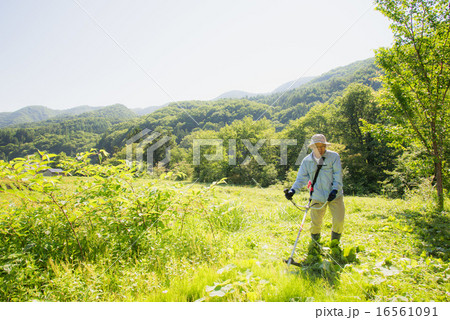 草刈機で草刈りをする高齢者 農作業 農業 おじいさん おばあさん 農家 栽培