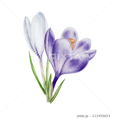 Watercolor white and purple blooming crocus flower isolated on white background. Spring and easter botanical hand painted saffron illustration. For designers, wedding, decoration, postcards, wrapping