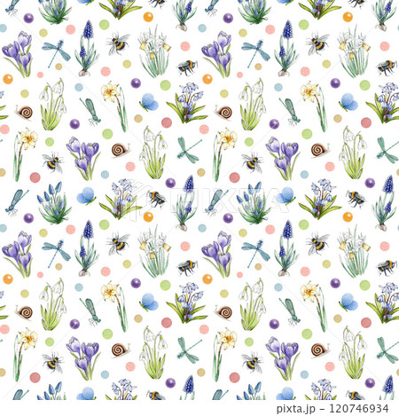 Springtime mood seamless pattern with primrose garden flowers, bees, butterflies on white background. Ideal for spring season decor element, seasonal cards, spring-themed design