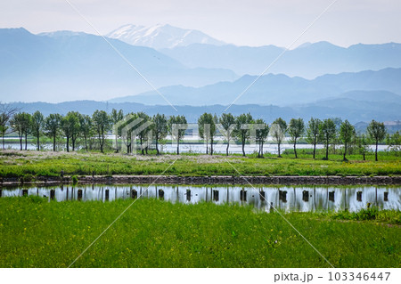 春の朝、晴れ渡った福島潟の水辺(新潟県新潟市)
