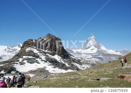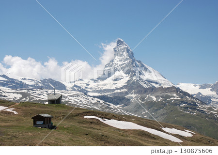 草原を行くトレッキングコースから眺める盛夏のマッターホルンの勇壮なパノラマビュー