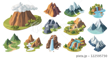 mountains isometric cartoon set. mountain rock waterfall, element nature summer snowy peaks mountainous rocky landscape vector illustration
