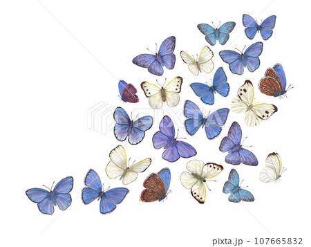 Watercolor flying white, blue butterflies. Copper, scarce copper, cabbage. Hand drawn illustration for postcard design, invitation template, birthday, mother day cards, wedding invitation