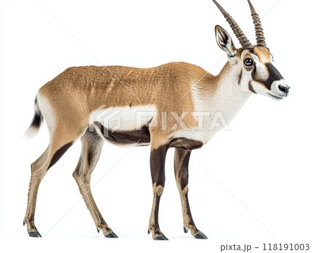 pronghorn captures attention with its striking horns and sleek body, positioned elegantly with its head turned, presenting a captivating profile against a clean white background.