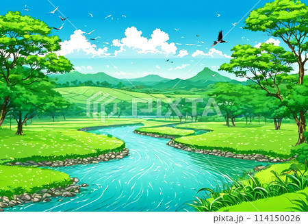 A traditional Japanese painting featuring a tranquil river in a beautiful mountain