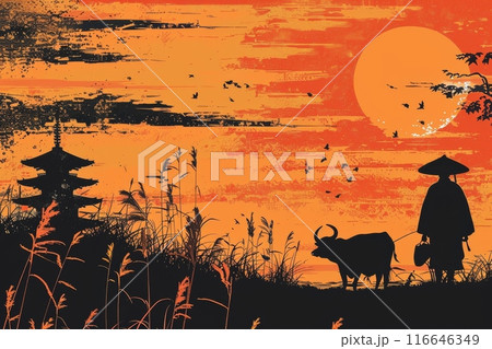 日本の風景の影絵(富士山・農業・シルエット)