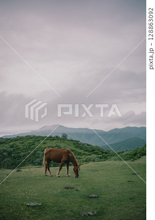 初夏の隠岐諸島 西ノ島の摩天崖に放牧される馬