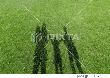緑の芝を背景にした親子で手を繋ぐ影、幸せ、家族、絆、愛情のイメージ