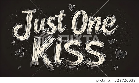 Artistic chalk-style text Just One Kiss surrounded by small hand-drawn hearts on a blackboard background, conveying a romantic and playful theme.