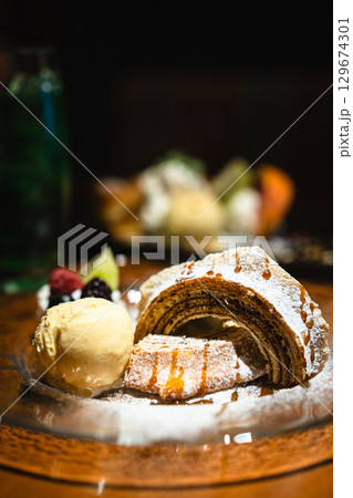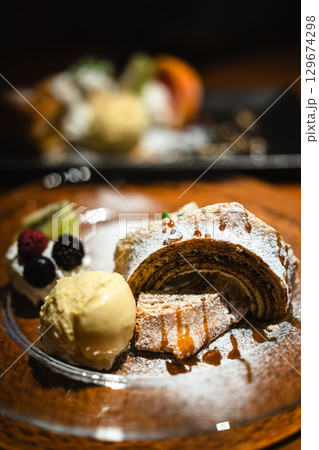 草木万里野のバウムクーヘンとアイスのデザートプレート