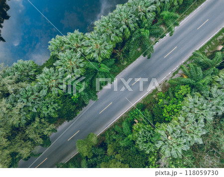 Aerial view of trail in spring tropical forest