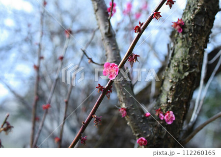 梅園にピンク色の梅の花が咲いています。