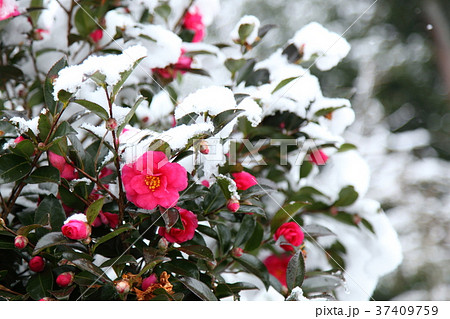 寂光院参道の雪の山茶花
