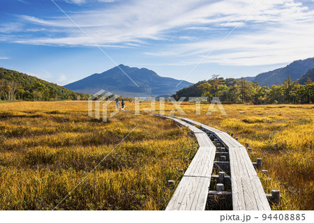 群馬県玉原の秋の玉原湿原と木道の風景