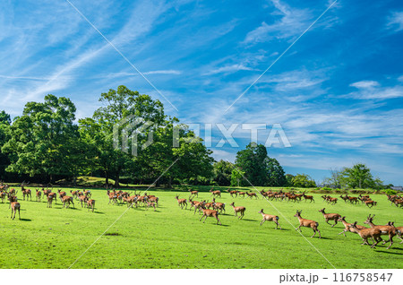 森に走りこむ鹿の群れ 奈良公園飛火野園地