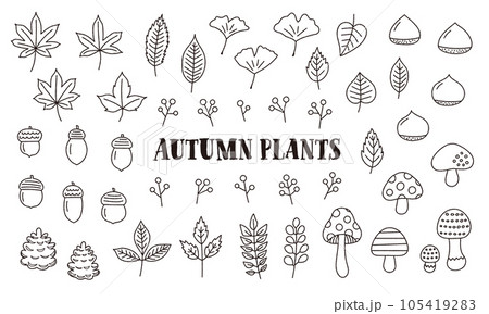 秋の植物の手書き線画ベクターイラストセット/紅葉・イチョウ・どんぐり・栗・きのこ・赤い実