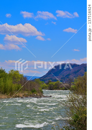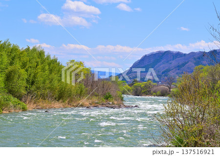 朝日射す早朝 荒瀬の利根川 上牧発電付近の風景 みなかみ町