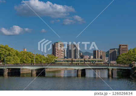 広島市の川辺の風景 荒神橋を走る市内電車