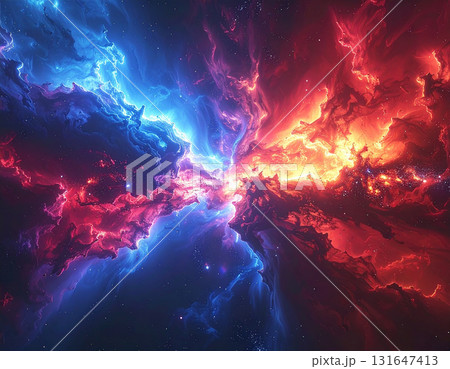 赤と青の宇宙が対峙しているような光の奔流が世界を分断する壮大な宇宙の景色