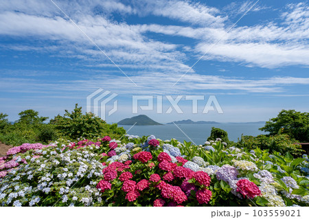 香川県三豊市志々島の天空の花畑の紫陽花と美しい瀬戸内海