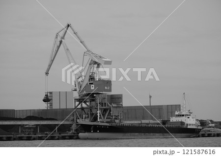 水島製鉄所で荷役をする船の船体とクレーンの景色
