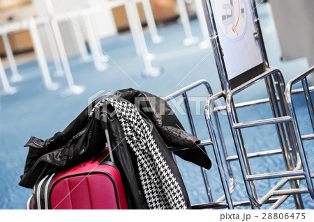 Large polycarbonate suitcase in the airport terminal, travel concept of baggage or luggage.